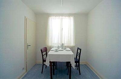 我时常考虑,我们是否知道如何真正地为居住空间带来生命力。在居住空间内,人们日常的行为是否可以真正地为空间带来生机?日复一日的洗漱、吃饭、睡觉,这些起居行为本身的确使空间活跃,然而若不能触及空间的结构核心,也不能为空间带来持久的成长。米歇尔·德·塞尔托在《日常生活实践》中指出,普通人的日常行为仅是对空间的使用,是临时性(temporary)与战术性(tactic)的,而空间自发生长所需要的策略性(strategic)结构需要得到深层的环境支持,否则行为活跃不能等同于空间生机。虽然塞尔托的理论更多指向公共空间,但我们可以假设这种策略性结构在住宅空间同样适用。如果只是出于方便日常使用的目的,将咖啡桌随手摆在咖啡机旁边,那么就忽略了围绕咖啡桌可能产生的各种生机,甚至反而会被咖啡桌所在的角落限制。人们毫无策略的行为不仅不能为空间带来深层作用,还会毫无察觉地受到空间的反作用。就像格雷戈尔·施耐德在他的艺术作品中提醒我们那样,对待住宅中的日常场景要保持警惕。艺术家通过他著名的《Haus u r》作品,成功地为观众带来恐惧、焦虑和压抑等种种不适──这些不适感受强迫观众提问,熟悉的房间为何失去了熟悉的安全:住宅在多大程度上保护了我们,我们又在多大程度上囿于住宅?“家(Heim)是有点异样的(unheimlich)。”他说。从 1985 年开始,施耐德在父母留下的一栋普通住宅里建造房中房:在墙前砌墙、在窗前装窗、在地板上铺地板。一些房间被完全复制,一些被旋转。在十号房间咖啡室(Raum 10 Kaffeezimmer)中,艺术家在窗边放置了一张方型咖啡桌与两把对坐的椅子(图 9 – 10)。当观众站在空间里,脑海中浮现出“喝咖啡”的熟悉场景,然而房中房异样的安静与气闷却又令他们产生怀疑。作品由一个接一个寻常而反常的房间组成,这些房间串联起行为模式的轨迹。空间在多大程度上刺激了行为模式?当空间的刺激是消极的,行为与空间的互动便形成负面循环。如何在这种相互影响中定位生机的锚点,无论是物理空间还是人类行为?