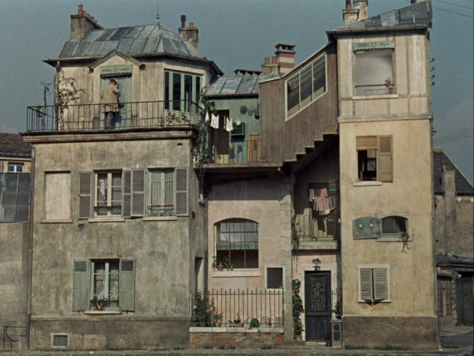 当我试着在这间保留着十几年前装修风格的 50 平方米出租屋找出一个连接水电位、流线和收纳合理的“扫拖一体机出入位置”时,却遇到了困难(图 14)。在我脑中很难画出一个逻辑完美的平面布局。在玛格丽特·许特 – 利霍茨基(Margarete Schütte-Lihotzky)设计的法兰克福厨房中,新兴的家具和电器遵循高效的流线,被妥善安置在 1.9 米宽、3.4 米长的空间两侧。厨房的宣传短片里,这位留着时髦短发的建筑师说:“家务劳动和工厂、办公室工作一样,目标都是以最小的努力获得最大的成效。”原有的厨房功能首先被类型化分类,继而有条不絮地重新规划在这个住宅机器的布局里(图 15 – 17)。除了家具和电器,她还设计了适配于这套厨房的牛奶桶,可以像抽屉一样插在柜子的第一层,使用时只需要抽出来,并且完全不占用表层空间。或许建筑学训练了一种理性主义倾向:将空间量化、将功能量化。虽然法兰克福厨房展示了它作为设计的先进,但也预设了当时每一个在厨房工作的中产阶级德国女性对这一套“完美工作流程”的服从。在《波茲坦的夜晚》这幅画中,洛特·拉瑟斯坦(Lotte Laserstein)描绘了一个典型的新女性画面:女人们留着短发,穿着方便行动的中裙和低跟鞋,画面左侧的女人手扶栏杆,远眺波茲坦夜景,右侧的女人在为自己倒饮品。坐在中心位置的女人手臂交叉放在桌上,眼睛微微低垂、若有所思。桌面上放着简单的冷餐:面包、水果和饮品。构图中的男人数量少于女人,两个男人围绕着中心的女人交谈(图 18)。画面展示了一种形象:更多地参与社交活动、独立思考、自主工作的新女性形象,而并非做饭、服务客人、照顾家庭的传统角色。当在法兰克福厨房中做饭的新女性发现,这种合理的设计不仅不能让自己尽快解脱于厨房事务,反而被迫留在这个格子间与世隔绝之后,对这种完美逻辑的支持便下降了。考虑到法兰克福厨房在后续住宅发展中没有被广泛接纳,我开始反思不该去为扫地机器人寻找一个完美位置──一个完美位置是否反而会对我与出租屋两年的相伴产生限制?雅克·塔蒂在 1957 年的电影《我的舅舅》里展示了另一种空间布置方式,一种拓扑似的、充满未知乐趣的布置方式。电影首先展示了主角小侄子杰拉德与父母居住的现代主义住宅,住宅具有高效的流线、摩登的装潢和配置先进电器的厨房,一家人的生活有如精密仪器般准确,但他每天最开心的时光是不太准时的舅舅接他放学后共度的几个小时。舅舅于洛先生的家明显的与现代主义住宅相反,是老城区一幢房子顶层不合理加建的阁楼(图 19 – 20)。这栋楼被住户们以社区化的方式共用,人们的生活轨迹拓扑地相交。房屋也保留着跟随住户的生活不断调整、成长的痕迹──它不仅是了生活轨迹相交的容器,同时也与其紧密相交。电影中于洛先生的每次出场都伴随着笑料:回家先上楼梯再下楼梯、在车间打瞌睡生产出没切段的塑料管、参加花园派对时扎破水管……于洛先生三部曲的最后一部《玩乐时间》中,舞会的玩乐终于解放了被现代社会禁锢的个体,玩笑、惹祸、犯错是一种人性的复原。在将隐藏的心底世界与外部世界相交的尝试中,或许不该寻求完美理性的庇护,而是保留一定的容差值,才能够持续地将人与空间的内部结构保持联结,空间的深层生命力也可以在线性的时间中成长。雅克·塔蒂给我们展示了一种容易掌握的方法,即通过幽默保持宽容──像于洛先生般不去校准的生活是主体性的自由表达,也是内部联结的柔和存续。